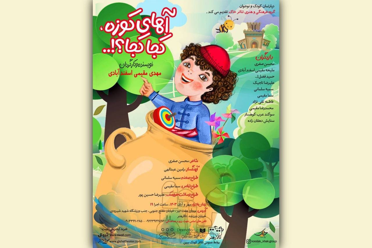 نمایش «آهای کوزه کجا کجا» به نویسندگی و کارگردانی مهدی مقیمی اسفندآبادی و کاری از گروه هنری تئاتر خاک، از روز یکشنبه ۸ مهر ۱۴۰۳، ساعت ۱۹ روی صحنه خواهد رفت.